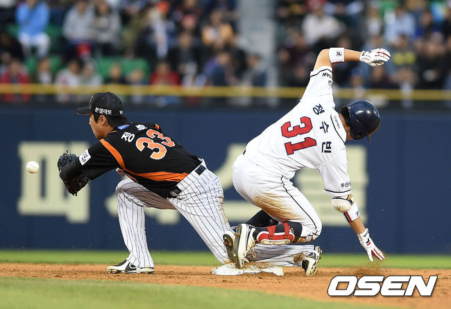4회말 무사 2루에서 두산 정수빈이 1타점 적시 2루타를 날리고 세이프되고 있다.