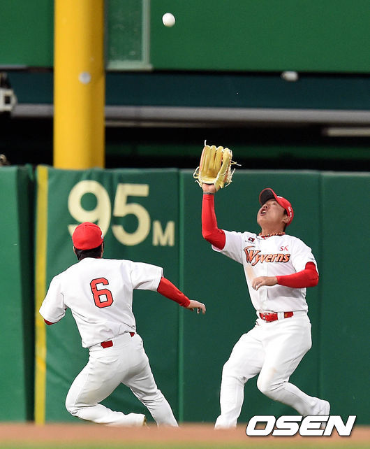 18일 오후 인천SK행복드림구장에서 열린 '2015 타이어뱅크 KBO 리그' SK 와이번스와 LG 트윈스의 경기 6회초 1사 1루 양석환의 뜬공을 박재상이 잡고 있다.