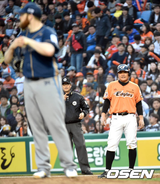 18일 대전 한화생명이글스파크에서 열린 2015 타이어뱅크 KBO리그 한화 이글스와 NC 다이노스의 경기 5회말 무사 2루 김태균이 해커의 공에 맞고 화난 표정을 짓고 있다.