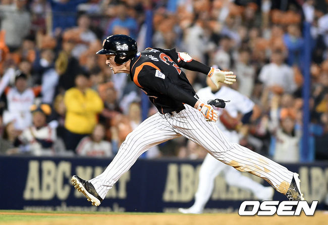 6회초 무사에서 롯데 아두치가 3루타를 날리고 슬라이딩하며 세이프되고 있다.