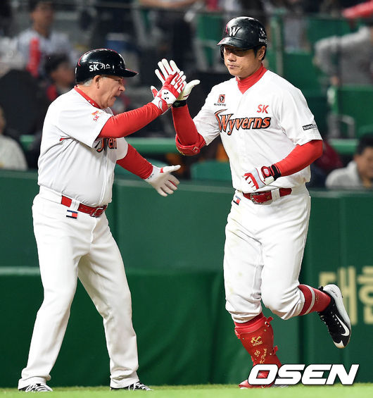 18일 오후 인천SK행복드림구장에서 열린 '2015 타이어뱅크 KBO 리그' SK 와이번스와 LG 트윈스의 경기 7회말 2사 박정권이 투런홈런을 치고 알바레즈 코치와 하이파이브를 하고 있다.