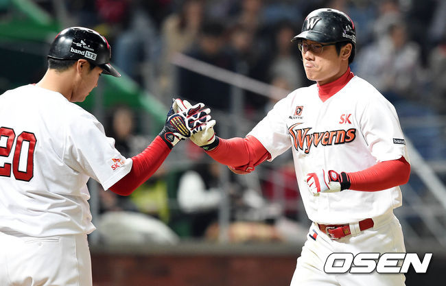 18일 오후 인천SK행복드림구장에서 열린 '2015 타이어뱅크 KBO 리그' SK 와이번스와 LG 트윈스의 경기 7회말 2사 박정권이 투런홈런을 치고 이재원과 하이파이브를 하고 있다.