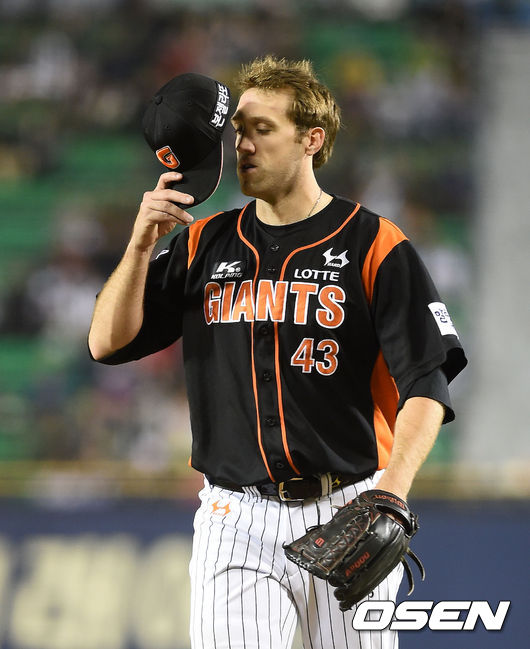 9회말 무사에서 롯데 린드블럼이 두산 정진호에 볼넷을 허용하며 마운드에서 내려오고 있다.