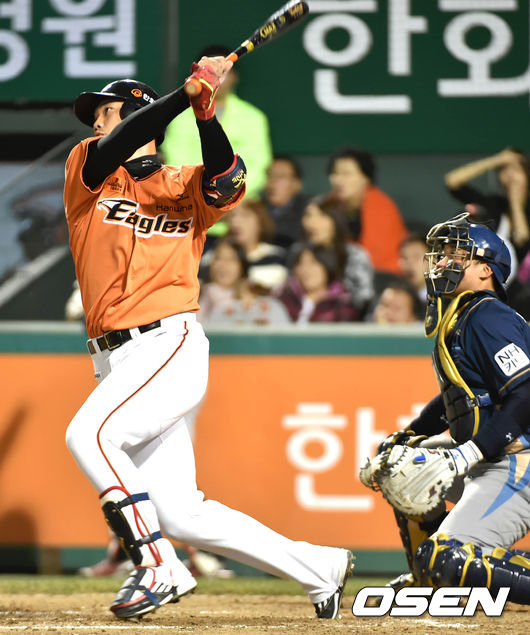 18일 대전 한화생명이글스파크에서 열린 2015 타이어뱅크 KBO리그 한화 이글스와 NC 다이노스의 경기 7회말 2사 2루 최진행이 역전 투런 홈런을 치고 있다.