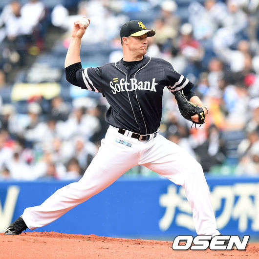 1회말 무사에서 소프트뱅크 선발투수 스탠드릿지가 힘차게 공을 던지고 있다.