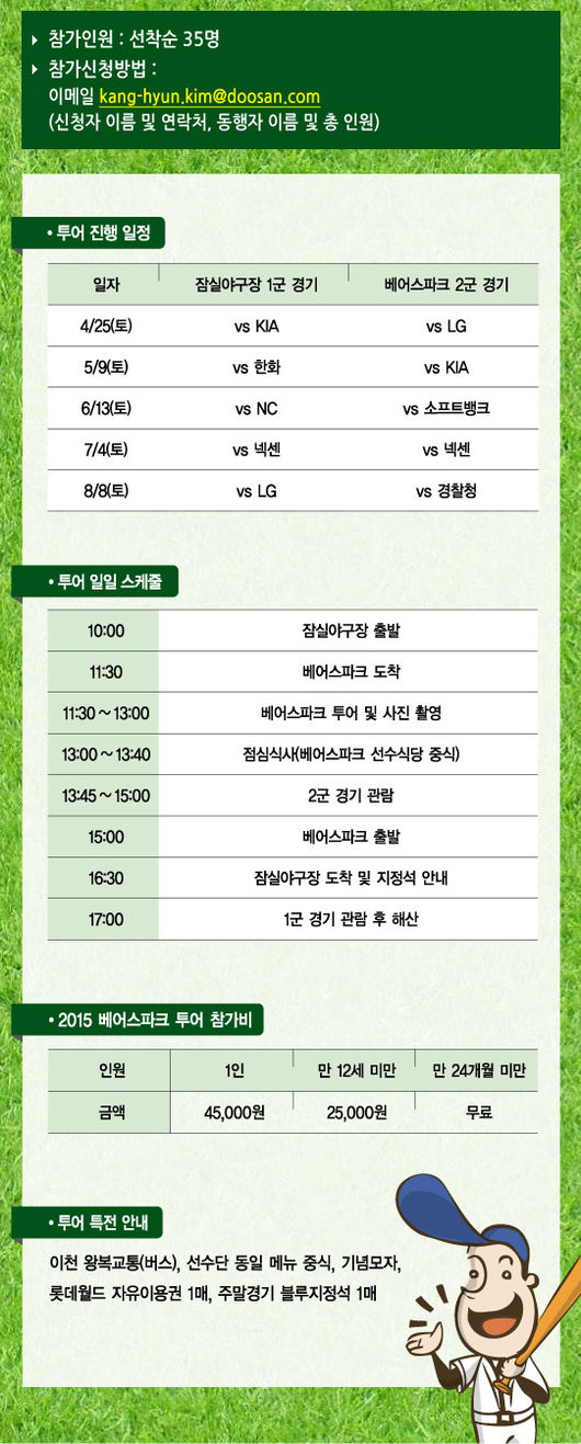 베어스파크 투어에 참가를 희망하는 팬은 이메일(kang-hyun.kim@doosan.com)로 신청하면 된다. 참가비는 1인당 4만5천원이고, 12세 미만의 어린이는 2만 5천원이다.(단, 만 24개월 미만의 유아는 무료)