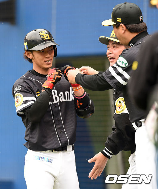 7회초 무사에서 소프트뱅크 이마미야가 좌월 솔로 홈런을 치고 더그아웃에서 동료들과 하이파이브를 하고 있다.