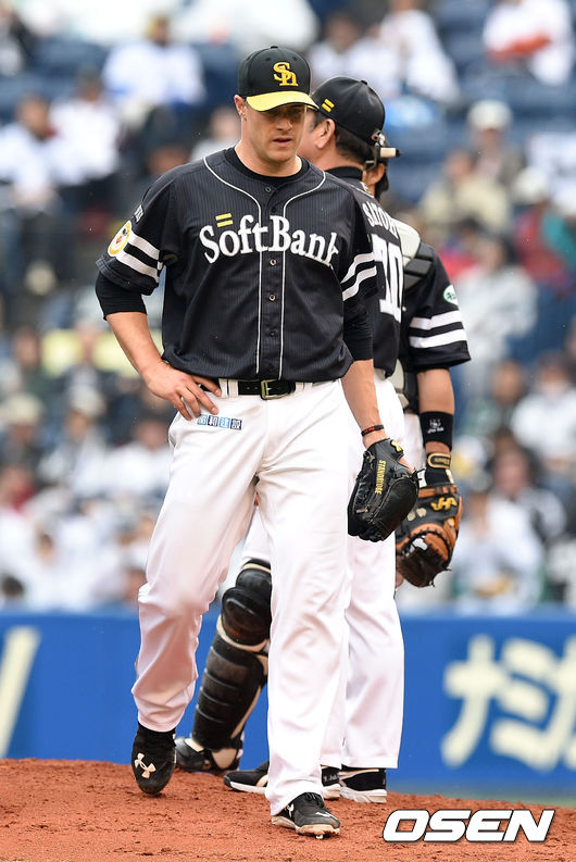 7회말 1사 1루에서 소프트뱅크 스탠드릿지가 마운드를 내려가고 있다.
