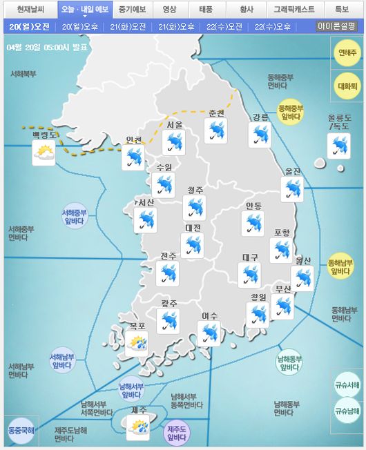 [OSEN=이슈팀] '곡우'인 20일 오늘 전국 날씨는 대체로 흐리고 비가 오며 서울과 경기도를 시작으로 늦은 오후 대부분 그칠 전망이다. 강수확률은 60~80%.