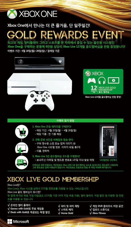 한국 MS에 따르면 엑스박스 원 골드 리워드 이벤트는 결제일 기준으로 4월 20일부터 4월 26일까지 7일간 엑스박스 원(Xbox One)을 구매한 모든 이를 대상으로 실시된다.