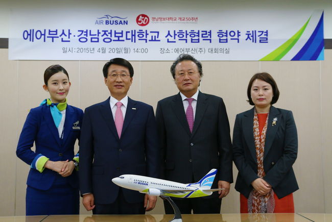 한편 이날 업무협약식에는 경남정보대학교 항공관광과를 졸업한 에어부산 캐빈승무원이 함께 2명 자리했다.