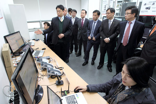 행사에 참석한 소프트웨어공학센터 이상은 소장(오른쪽 첫번째), KT 경영기획부문장 이문환 전무(오른쪽 두번째), 미래창조과학부 소프트웨어정책과 강도현 과장(오른쪽 세번째) 등 관계자들이 소프트웨어 검증 과정에 대해 설명을 듣고 있다. / KT 제공