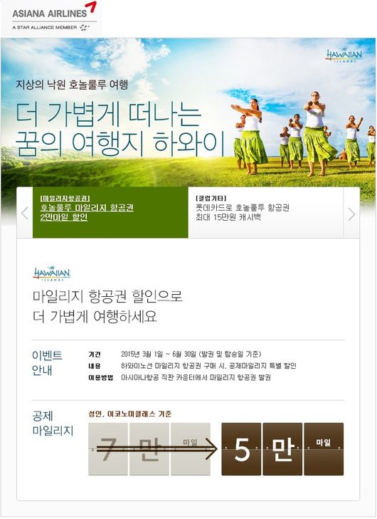이 행사는 성인, 이코노미 클래스인 경우에만 적용되며, 기존 7만 마일에서 5만 마일이 공제되는 할인 혜택을 제공한다. 공제를 받기 위해서는 인천~호놀룰루 왕복 항공권으로 발급해야 이벤트 혜택을 받을 수 있고, 6월 30일까지 출발에 한해 가능하다.