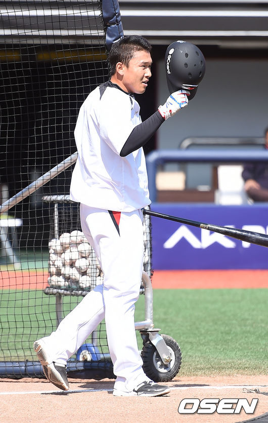 21일 수원 kt 위즈파크에서 열리는 '2015 타이어뱅크 KBO 리그' kt위즈와 SK 와이번스의 경기에 앞서 kt로 트레이드 된 윤요섭이 타격 훈련을 마치고 인사를 하고 있다.