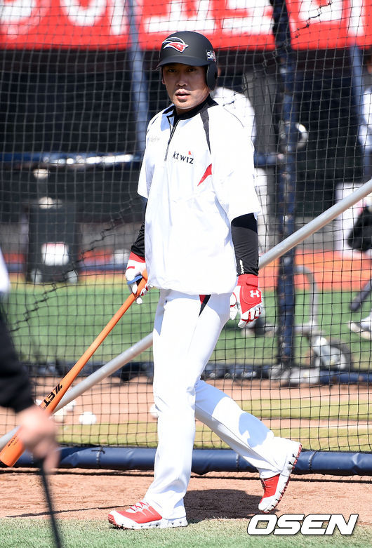 21일 수원 kt 위즈파크에서 열리는 '2015 타이어뱅크 KBO 리그' kt위즈와 SK 와이번스의 경기에 앞서 kt로 트레이드 된 박용근이 타격훈련 끝내고 더그아웃으로 들어가고 있다.