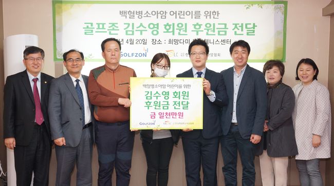 ㈜골프존(대표이사 장성원)은 지난 20일 부산 동래구의 희망다미 부산웰니스센터에서 프로모션 이벤트 당첨자인 김수영 후원자가 한국백혈병소아암협회에 당첨금액 전액을 기부하는 기증식을 가졌다고 21일 밝혔다.
