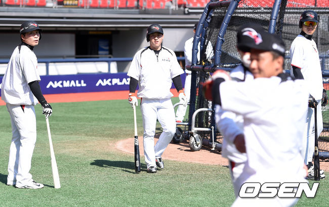 21일 수원 kt 위즈파크에서 열리는 '2015 타이어뱅크 KBO 리그' kt위즈와 SK 와이번스의 경기에 앞서 kt 용덕한과 이대형이 트레이드된 윤요섭을 바라보고 있다.