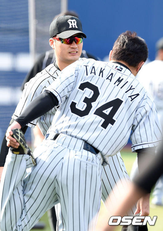 21일 오후 일본 가나가와현 요코하마 스타디움에서 열릴 2015 일본프로야구 요코하마 DeNA 베이스타스와 한신타이거스의 경기에 앞서 한신 오승환이 스트레칭 훈련을 하며 동료와 이야기를 나누고 있다.