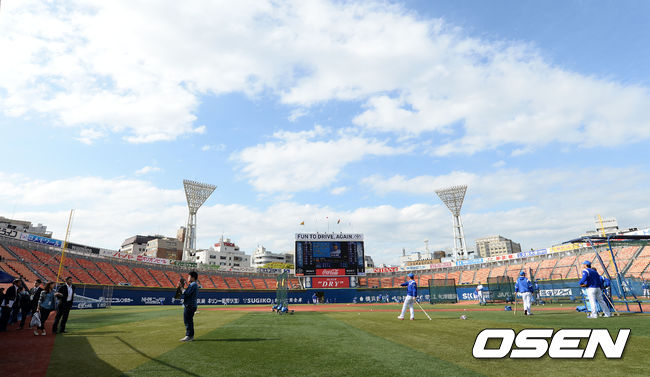 21일 오후 일본 가나가와현 요코하마 스타디움에서 열릴 2015 일본프로야구 요코하마 DeNA 베이스타스와 한신타이거스의 경기에 앞서 요코하마 선수들이 스트레칭 훈련을 하고 있다.