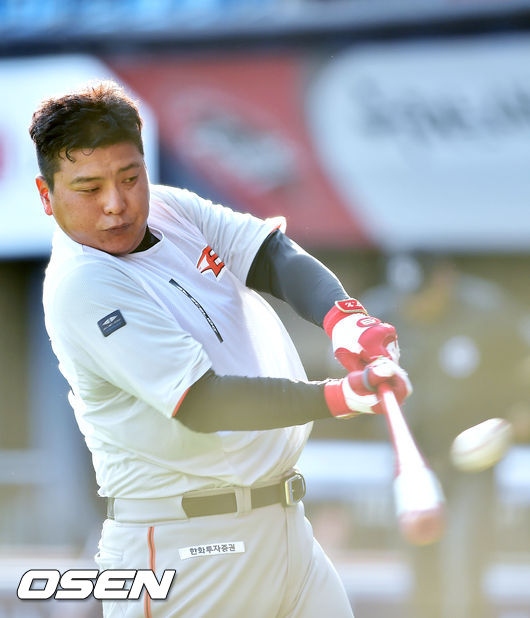 21일 오후 서울 잠실야구장에서 '2015 타이어뱅크 KBO 리그' LG 트윈스와 한화 이글스의 경기가 열릴 예정인 가운데 한화 김태균이 타격연습을 하고 있다.