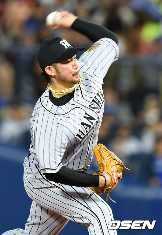 1회말 무사에서 한신 선발투수 이와타가 힘차게 공을 던지고 있다.