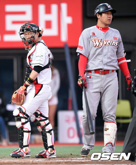 21일 수원시 수원 kt 위즈파크에서 열린 '2015 타이어뱅크 KBO 리그' kt위즈와 SK 와이번스의 경기, 1회초 1사 3루 SK 최정의 타석때 조동화를 볼넷 폭투로 3루까지 진루 시킨 kt 안중열 포수가 아쉬워하고 있다.