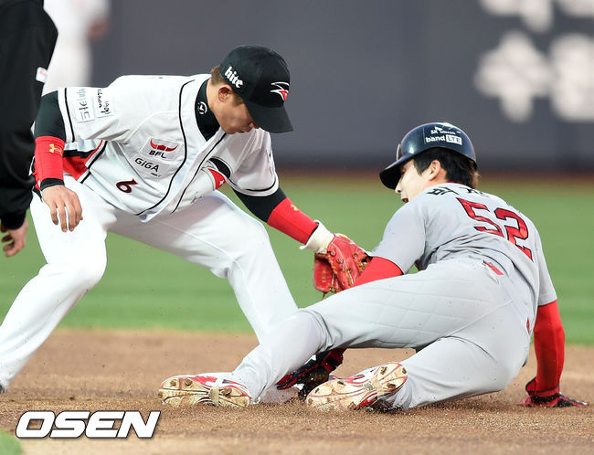 21일 수원시 수원 kt 위즈파크에서 열린 '2015 타이어뱅크 KBO 리그' kt위즈와 SK 와이번스의 경기, 2회초 1사 1루 SK 정상호의 타석때 1루 주자 박계현이 도루 성공하고 있다.
