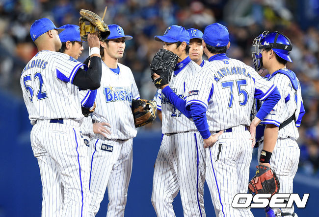 4회초 2 1,2루에서 마운드를 방문한 요코하마 선수들이 선발투수 구보와 이야기를 나누고 있다.