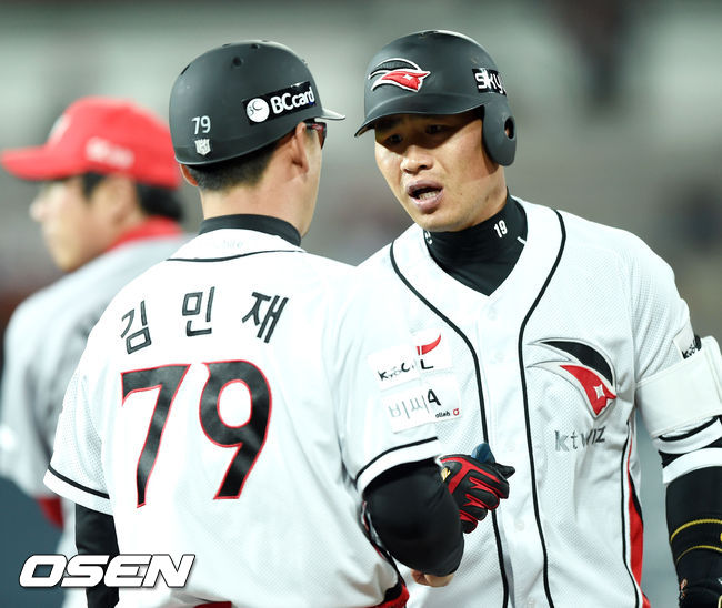 21일 수원시 수원 kt 위즈파크에서 열린 '2015 타이어뱅크 KBO 리그' kt위즈와 SK 와이번스의 경기,3회말 2사 1,2루 kt 김상현이 동점 1타점 적시타를 날리고 김민재 코치와 이야기를 나누고 있다.