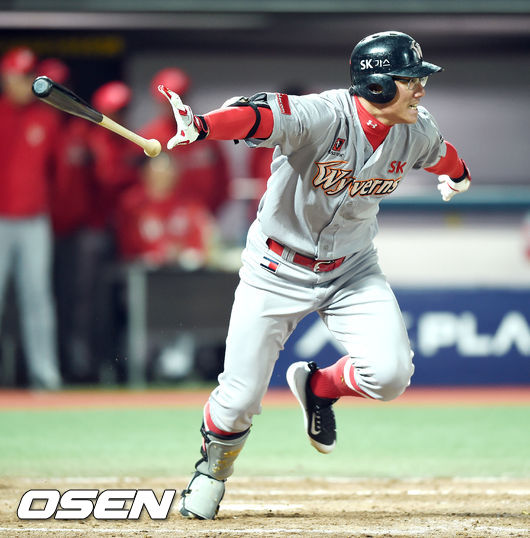 21일 수원시 수원 kt 위즈파크에서 열린 '2015 타이어뱅크 KBO 리그' kt위즈와 SK 와이번스의 경기,4회초 2사 만루 SK 박정권이 2타점 적시타를 날리고 있다.