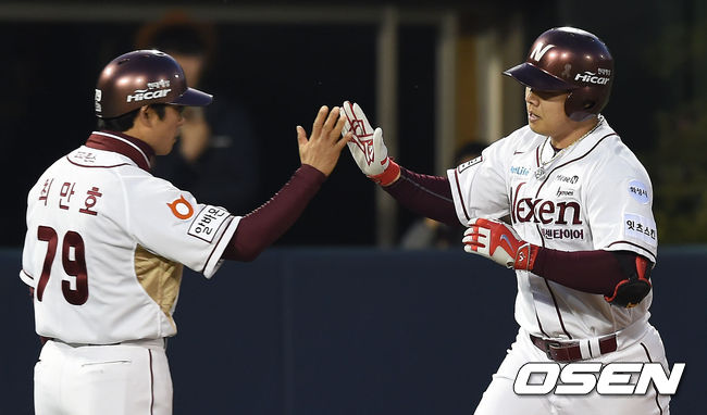 2회말 2사 1루 넥센 윤석민이 투런 홈런을 때린 뒤 최만호 코치와 하이파이브를 하고 있다.