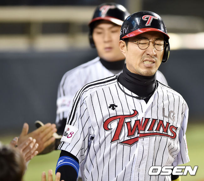 21일 오후 서울 잠실야구장에서 열린 '2015 타이어뱅크 KBO 리그' LG 트윈스와 한화 이글스의 경기, 5회말 2사 주자 만루 LG 이진영의 밀어내기 볼넷 이후 한화 정범모의 실책으로 LG 정성훈이 홈에서 세이프 된 후 오지환과 함께 덕아웃에서 동료들과 하이파이브를 하고 있다.