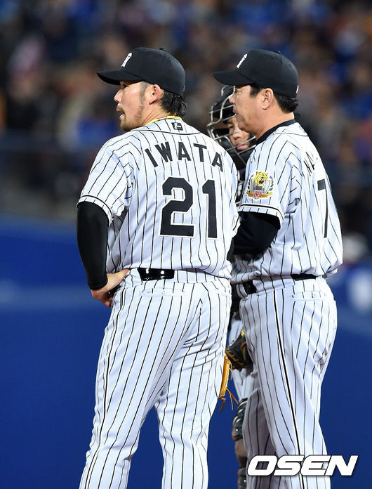 7회말 1사 1,2루에서 한신 선발투수 이와타가 마운드를 내려가고 있다.