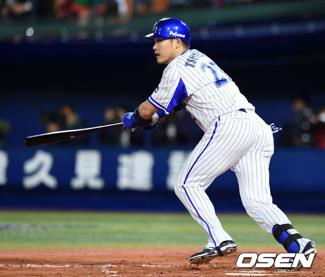 7회말 1사 1,2루에서 요코하마 쓰쯔고가 좌전 적시타를 치고 있다.