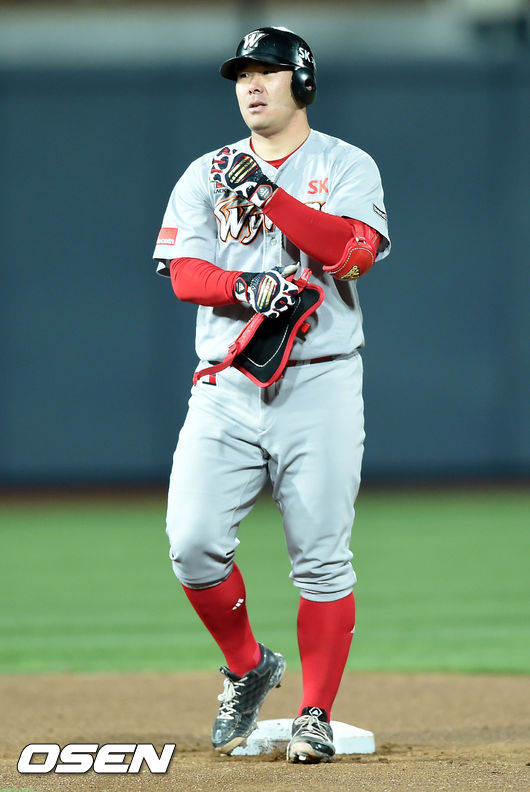 21일 수원시 수원 kt 위즈파크에서 열린 '2015 타이어뱅크 KBO 리그' kt위즈와 SK 와이번스의 경기,6회초 2사 만루 SK 이재원이 3타점 2루타를 날리고 타임을 요청하고 있다.