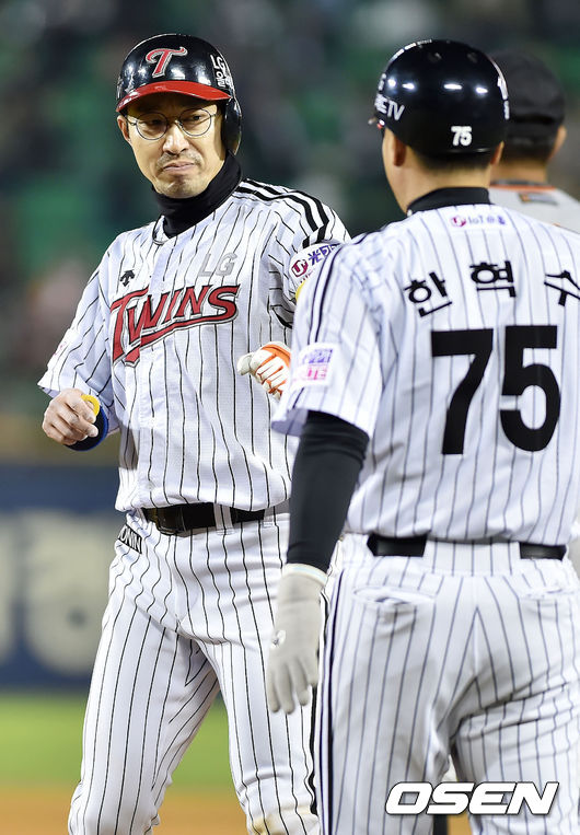 21일 오후 서울 잠실야구장에서 열린 '2015 타이어뱅크 KBO 리그' LG 트윈스와 한화 이글스의 경기, 6회말 2사 주자 1,2루 LG 정성훈이 좌익수 왼쪽 1타점 적시타를 날린 후 1루에서 한혁수 코치와 하이파이브를 하고 있다.