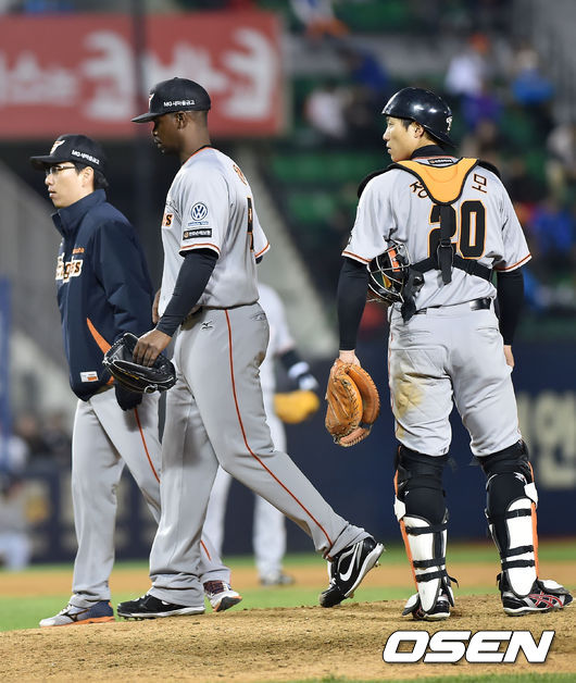 21일 오후 서울 잠실야구장에서 열린 '2015 타이어뱅크 KBO 리그' LG 트윈스와 한화 이글스의 경기, 6회말 2사 주자 1,2루 LG 정성훈 타석에서 한화 선발 유먼이 마운드를 내려가고 있다.