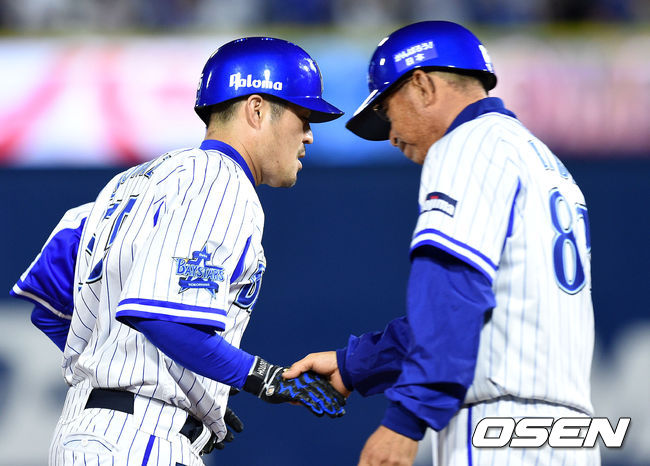 8회말 1사에서 요코하마 고토가 좌월 솔로 홈런을 치고 그라운드를 돌고 있다.