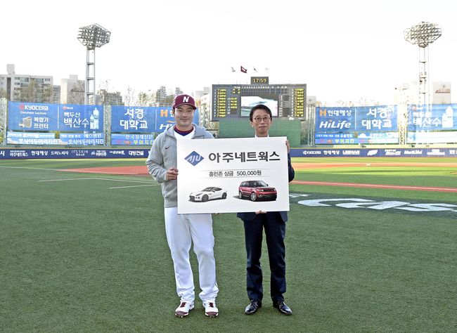 ‘아주네트웍스 홈런존’ 1호 홈런 주인공 박병호에게 상금을 전달하고 있는 정진 아주네트웍스 대표. /재규어 랜드로버 코리아 제공.