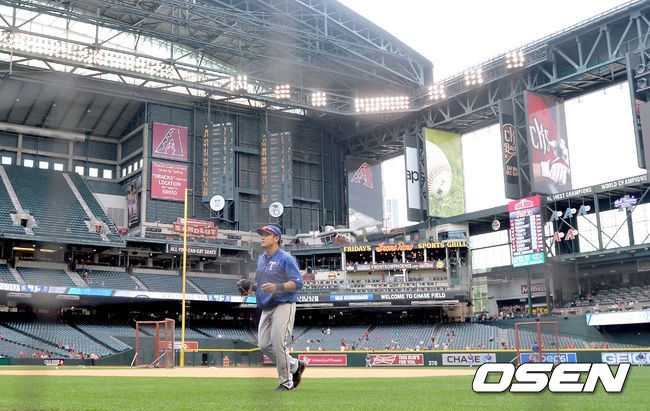22일(한국시간) 미국 애리조나 주 피닉스의 체이스 필드에서 열리는 '2015 메이저리그' 애리조나 다이아몬드백스와 텍사스 레인저스의 경기를 앞두고, 텍사스 추신수가 수비훈련을 마치고 이동하고 있다.