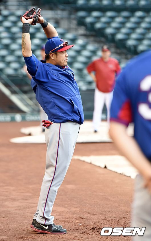22일(한국시간) 미국 애리조나 주 피닉스의 체이스 필드에서 열리는 '2015 메이저리그' 애리조나 다이아몬드백스와 텍사스 레인저스의 경기를 앞두고, 텍사스 추신수가 수비훈련을 앞두고 기지개를 켜고 있다.