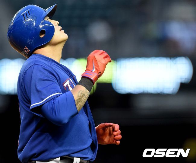 1회초 텍사스 공격 2사 3루 상황 추신수가 2루 땅볼을 치고 1루로 향하며 아쉬워하고 있다.