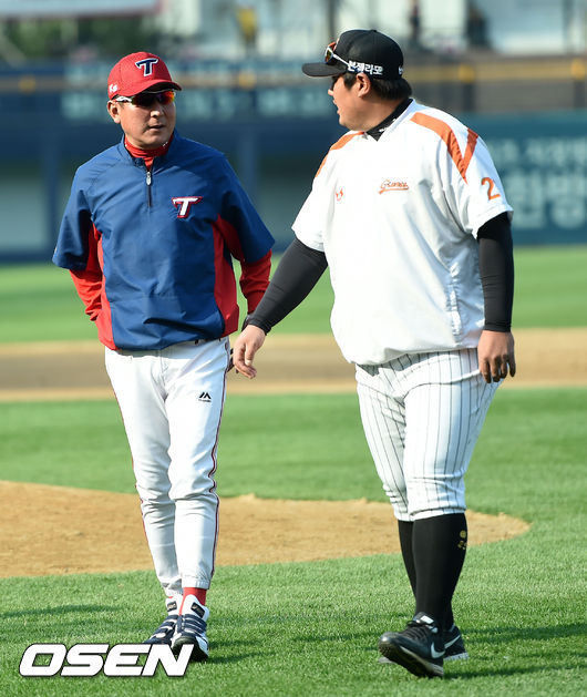 22일 오후 광주-기아 챔피언스필드서 열린 '2015 타이어뱅크 KBO리그' KIA 타이거즈와 롯데 자이언츠의 경기에 앞서 KIA 김기태 감독과 롯데 최준석과 이야기를 나누고 있다.
