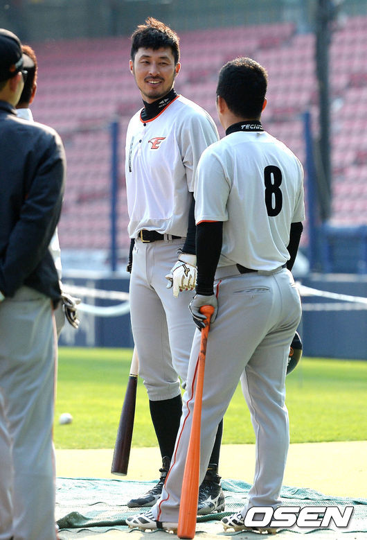 22일 오후 서울 잠실구장에서 열리는 '2015 타이어뱅크 KBO 리그' LG 트윈스와 한화 이글스의 경기 시작전 김경언과 정근우가 이야기를 나누고 있다.