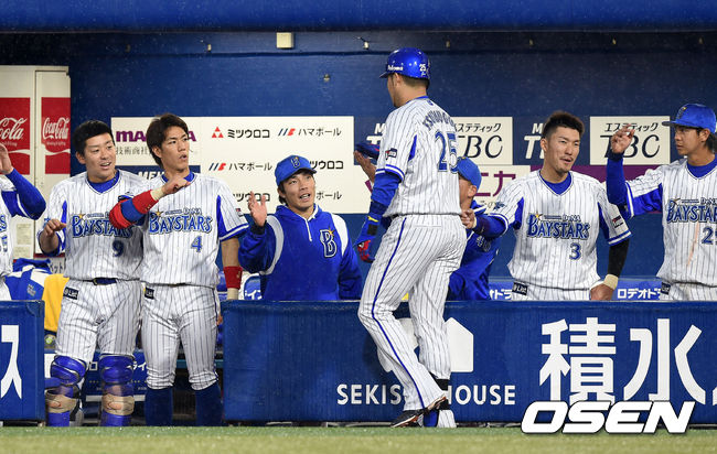 1회말 2사 3루에서 요코하마 쓰쓰고가 우월 투런 홈런을 치고 더그아웃에서 동료들과 하이파이브를 하고 있다.