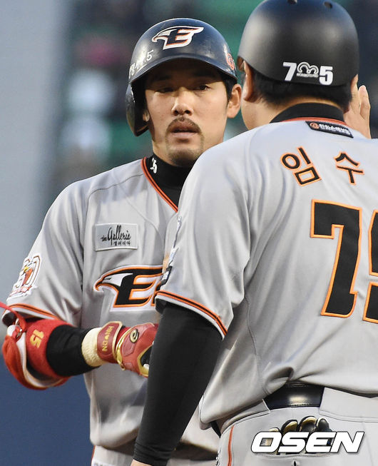 22일 오후 서울 잠실구장에서 열린 '2015 타이어뱅크 KBO 리그' LG 트윈스와 한화 이글스의 경기 2회초 2사 2,3루 이용규가 2타점 적시타를 치고 임수민 코치와 하이파이브를 하고 있다.