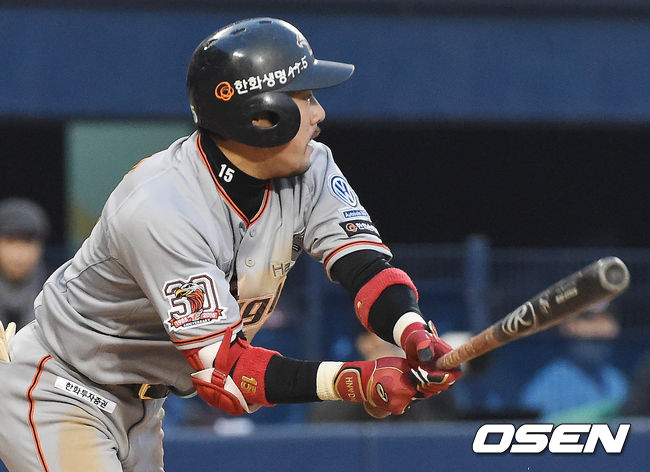 22일 오후 서울 잠실구장에서 열린 '2015 타이어뱅크 KBO 리그' LG 트윈스와 한화 이글스의 경기 2회초 2사 2,3루 이용규가 2타점 적시타를 치고 있다.
