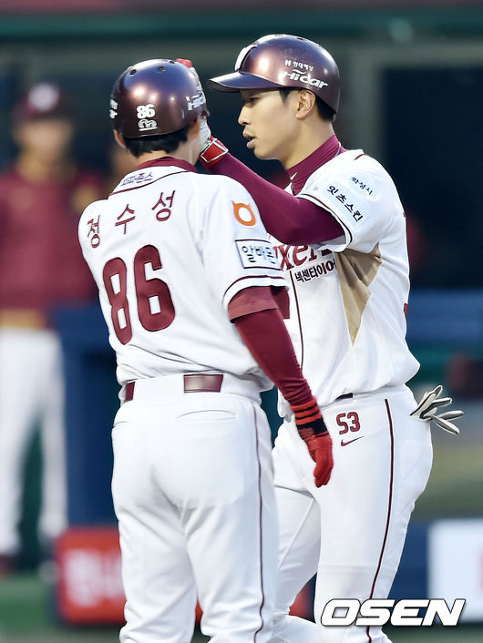 22일 오후 서울 목동야구장서 열린 '2015 타이어뱅크 KBO 리그' 넥센 히어로즈와 두산 베어스의 경기, 3회말 1사 넥센 고종욱이 솔로 홈런을 날린 후 홈에서 정수성 코치와 하이파이브를 하고 있다.