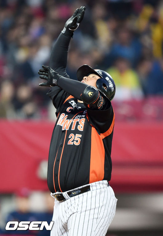 22일 오후 광주-기아 챔피언스필드서 열린 '2015 타이어뱅크 KBO리그' KIA 타이거즈와 롯데 자이언츠의 경기,3회초 2사 만루 롯데 최준석이 만루홈런을 날리고 세리머니를 하고 있다.