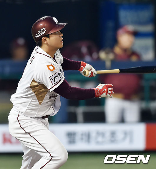 22일 오후 서울 목동야구장서 열린 '2015 타이어뱅크 KBO 리그' 넥센 히어로즈와 두산 베어스의 경기, 4회말 무사 주자 1루 넥센 김민성이 중견수 뒤 1타점 2루타를 날리고 있다.